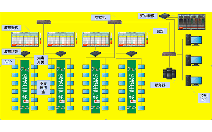 生產(chǎn)管理看板系統(tǒng)是指用于車間或生產(chǎn)線目視化管理(VM,Visual Management)的一種表現(xiàn)形式,即對(duì)數(shù)據(jù)、生產(chǎn)狀態(tài)等的情況一目了然地表現(xiàn),主要是對(duì)于生產(chǎn)進(jìn)度、生產(chǎn)狀態(tài)進(jìn)行的透明化管理設(shè)備。電子看板則通過利用形象直觀而又色彩適宜的各種視覺感知信息來組織現(xiàn)場(chǎng)生產(chǎn)活動(dòng),了解實(shí)時(shí)的生產(chǎn)進(jìn)度、產(chǎn)能、以及不良數(shù)等等。生產(chǎn)管理看板是發(fā)現(xiàn)問題、解決問題的非常有效且直觀的手段,是優(yōu)異的現(xiàn)場(chǎng)管理必不可少的工具之一;它是6s的基本工具。