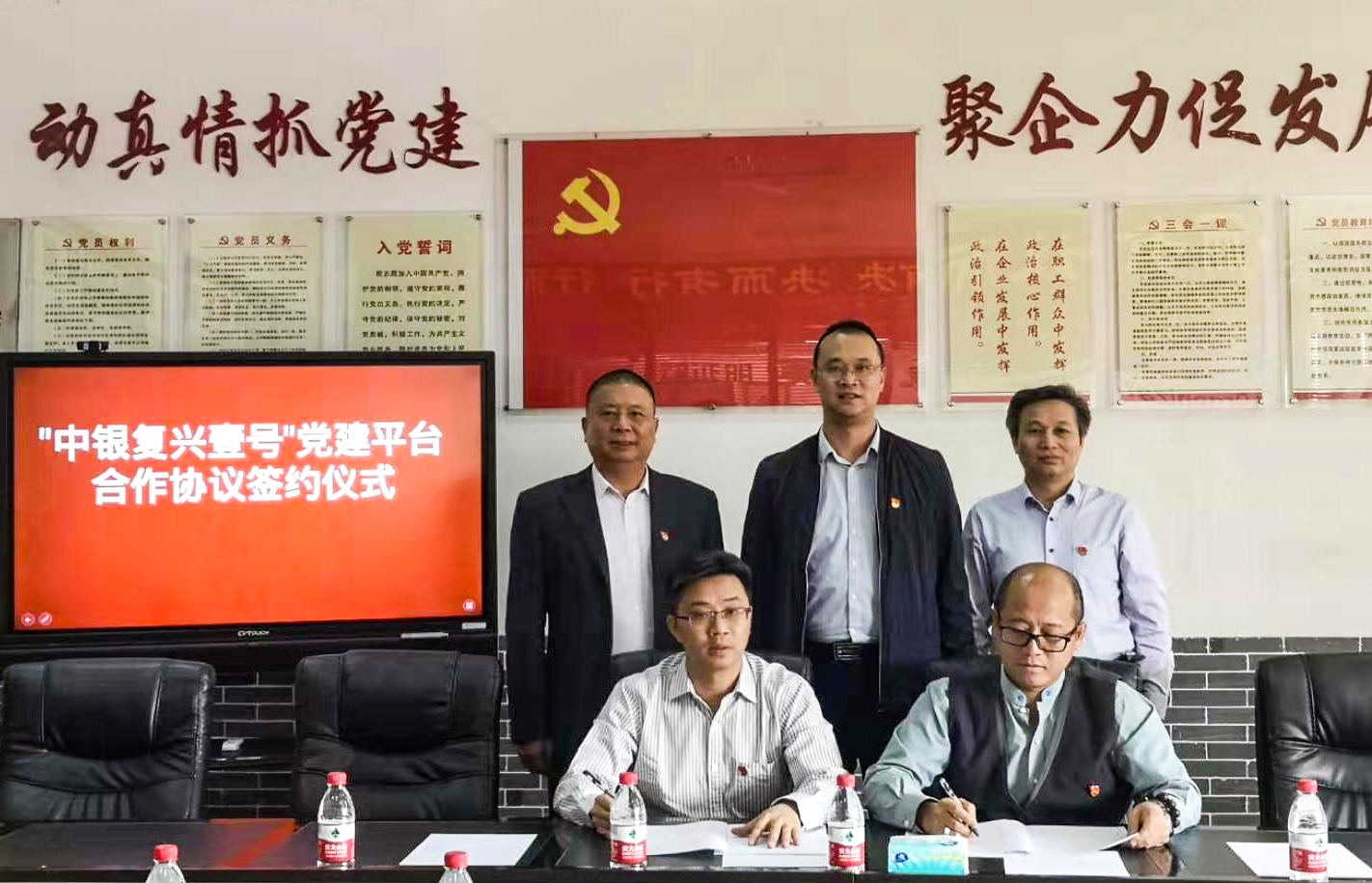 簽約儀式中,中國銀行東莞大嶺山支行行長、黨支部書記孫玉成與匯興智造董事長鐘輝共同簽署《“中銀復興壹號”黨建平臺合作協(xié)議》,就主題教育開展、基層黨組織互聯(lián)共建等方面進行了深入溝通交流。