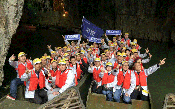 旅途第二站:仙橋地下河。仙橋地下河由兩段暗河和中間一段明河組成,自西向東,河面平靜。暗河內(nèi)鐘乳石、石灰?guī)r形態(tài)各異,有的像水母;有的像龍爪;有的像觀(guān)音;有的像關(guān)公,三分形象,七分想象,很是有趣,加上彩燈,地下河更是被妝點(diǎn)得美輪美奐。美好的事物總是能引發(fā)人類(lèi)對(duì)美好未來(lái)的憧憬,“夢(mèng)想之旅”的團(tuán)隊(duì)成員們坐在船上,激情萬(wàn)分地大喊:“匯興智造是我們的船,而我們?cè)诖??!蔽覀儗P(yáng)帆啟航,來(lái)一場(chǎng)創(chuàng)世之旅,去尋找那屬于匯興人的桃源之地。