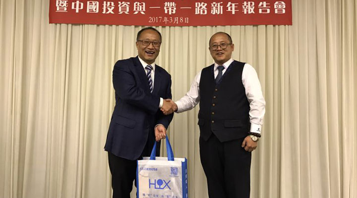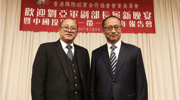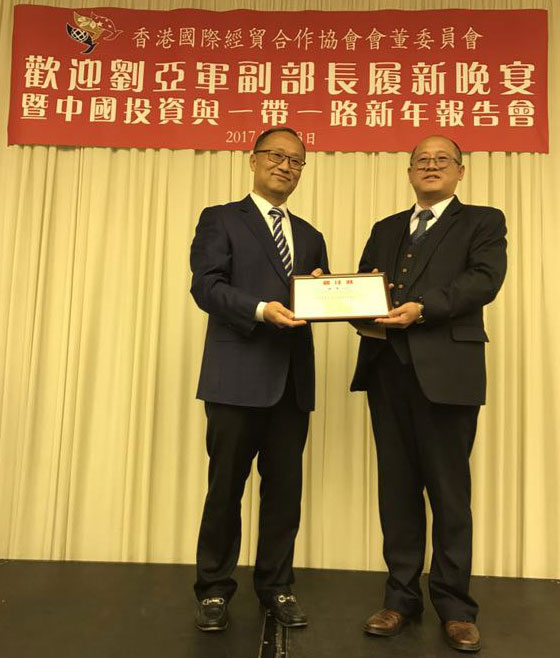 2017年3月8日,匯興智造董事長鐘輝受邀參加由香港國際經(jīng)貿(mào)合作協(xié)會會董委員會在港島陽明山莊舉辦的“歡迎劉亞軍副部長履新晚宴暨中國投資與一帶一路新年報告會”。