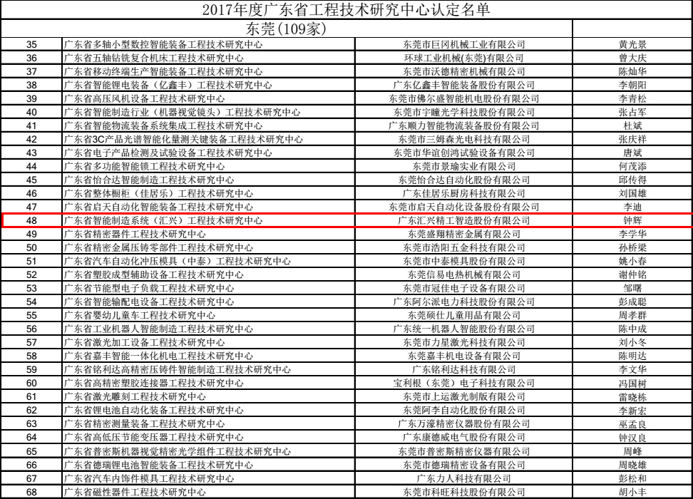 2017年9月25日,匯興智造設(shè)立的 “廣東省智能制造系統(tǒng)(匯興)工程技術(shù)研究中心”被廣東省科技廳認(rèn)定為“2017年度廣東省工程技術(shù)研究中心”。省級工程技術(shù)研究中心的建設(shè)是為了深入貫徹落實(shí)廣東省科技創(chuàng)新大會精神,推進(jìn)規(guī)模以上企業(yè)建立研發(fā)機(jī)構(gòu),增強(qiáng)高校和科研院所的技術(shù)創(chuàng)新能力,加快科技成果轉(zhuǎn)化,為建設(shè)國家科技產(chǎn)業(yè)創(chuàng)新中心提供支撐。